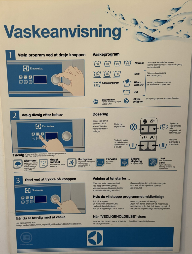 I vaskeriet hænger der vaske- og tørreanvisninger til brug af maskinerne. Nedenfor ses en kopi af disse anvisninger.